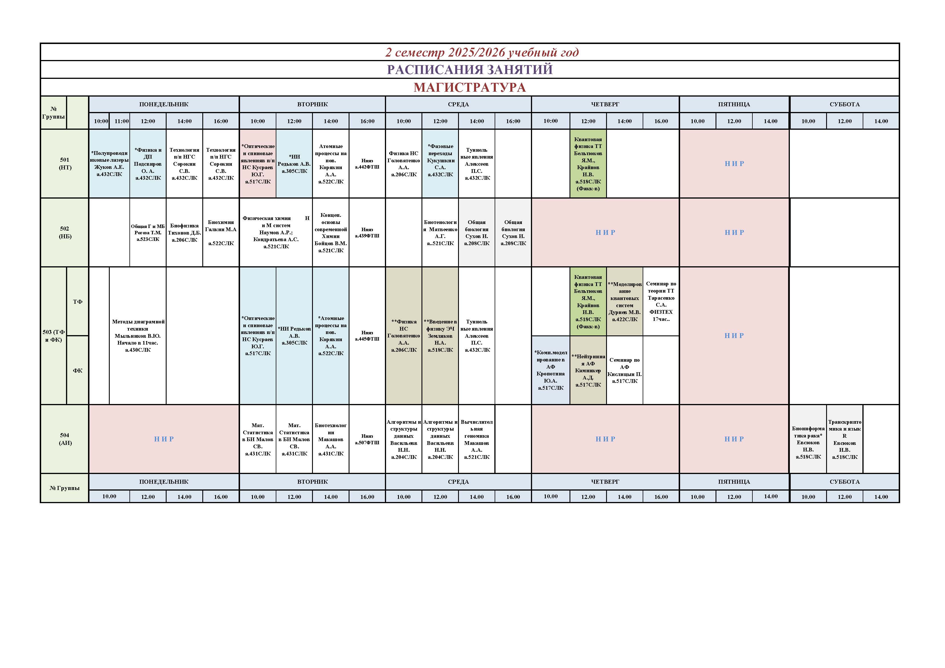 Расписание занятий студентов очной формы обучения  на 2 семестр 2025-2026 учебного года (магистратура)